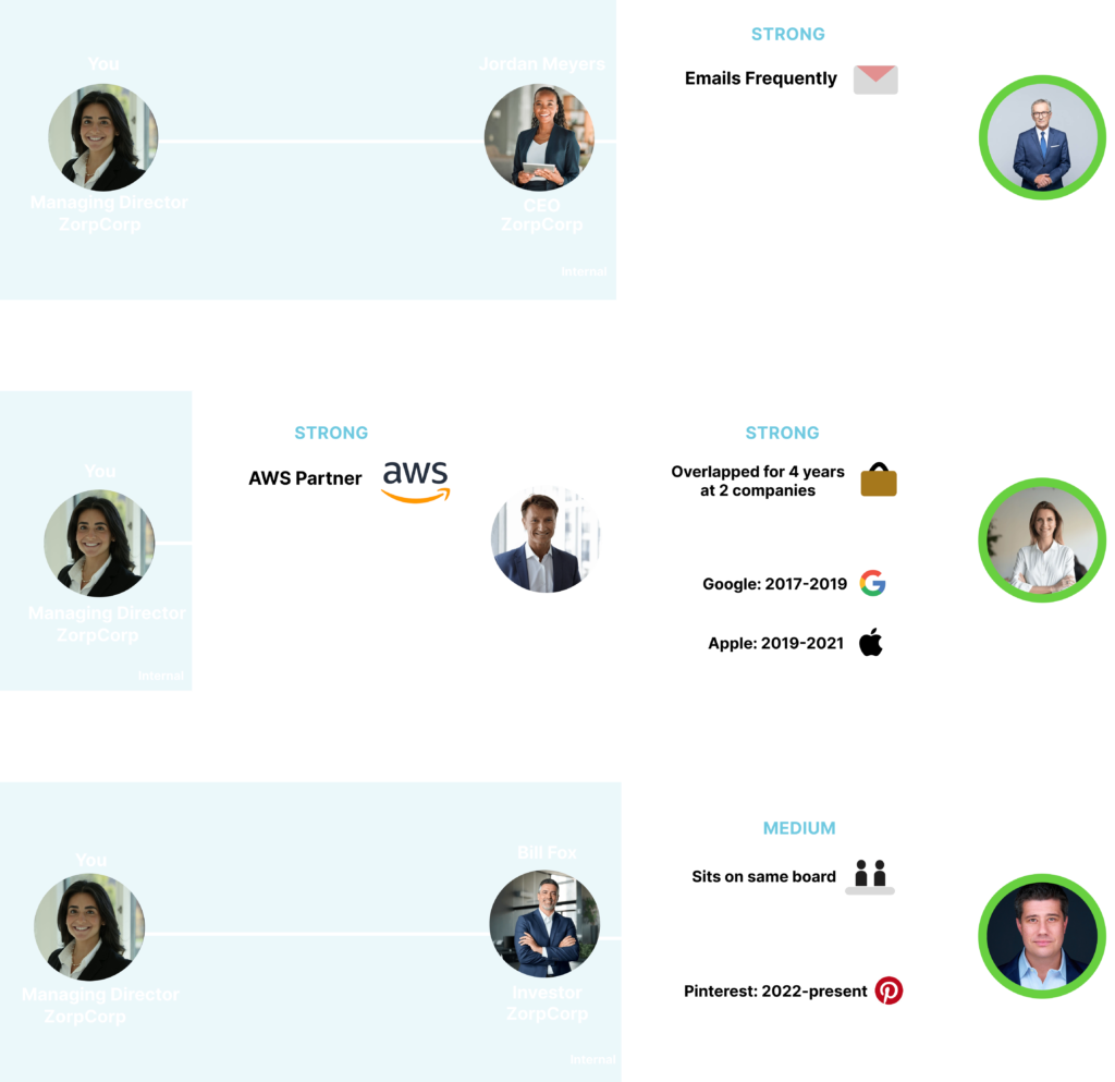 People are fed up of going to multiple systems. We enable our clients to have one place where client-facing people can find a warm intro to any client, prospect or target.